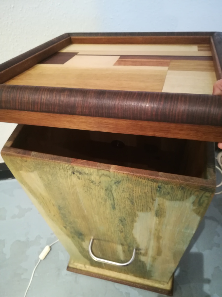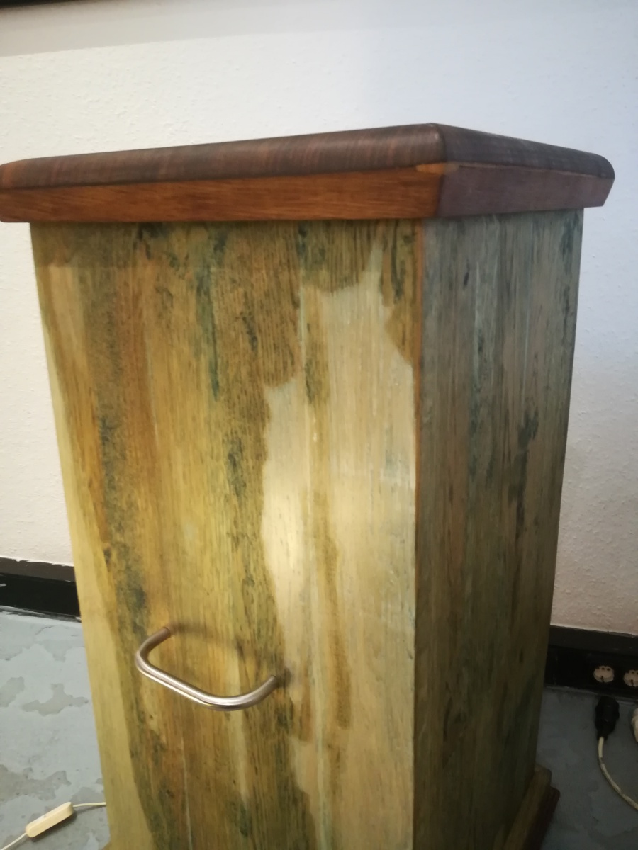 Das Rednerpult ist mit einer Tür auf Rollen zum öffnen, ein Design-Kunststück von Josef Greiner. Es hat eine optimale Höhe um daran zu stehen. Mit gerundeter Auflage oben. Die Tür öffnet sich und birgt Fächer und Ablagen. Im Korpus befindet sich eine Schublade zum abschließen und ebenfalls mehrere Fächer. Bei geschlossener Tür kann man das Rednerpult an der Seite abschließen.