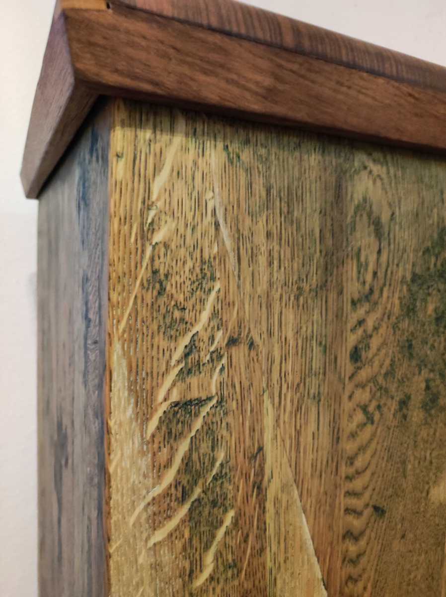 Die Eichentruhe ist eine traditionelle Runddeckeltruhe, die auf einem Gestell steht. Mit vielen Details wird dort spielerisch die Entwicklung der Holzverarbeitung darstellt. Vom urwüchsigen Holz bis hin zur hohen Drechselkunst. Eines der ältesten Möbel der Welt.